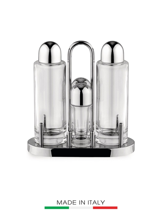 Bộ đựng gia vị: dầu, giấm, muối và tiêu được làm bằng thép không gỉ 18/10, đánh bóng.