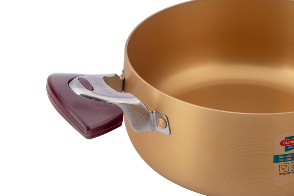 - Kiểu dáng hiện đại, kết cấu bền chắc: Sản phẩm được làm từ hợp kim nhôm Anod cứng bằng công nghệ tiên tiến giúp sản phẩm có độ cứng và bền vững cao, chống ăn mòn, chịu được nhiệt độ cao cũng như khả năng chống dính tốt. Vỏ ngoài màu vàng nổi bật, chịu nhiệt tốt, không biến màu theo thời gian.