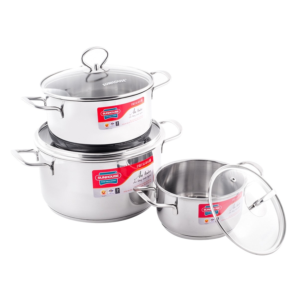 Quy cách đóng gói Bộ 3 nồi có đường kính 16cm, 20cm, 24cm và 3 vung bằng thủy tinh chịu nhiệt SKU 1223145448707 Model SH888 Chất liệu - Thân nồi: Inox không gỉ