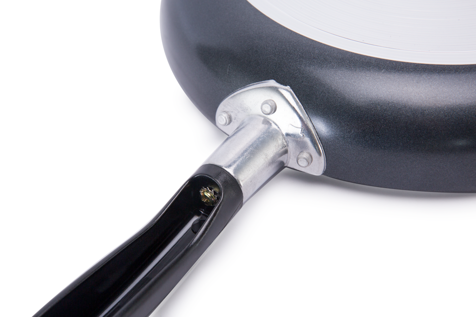 - Tay cầm: Tay cầm được bắt vít chắc chắn vào thân chảo, đảm bảo an toàn trong quá trình sử dụng, nâng nhấc, di chuyển. Cán cầm bằng nhựa chịu nhiệt siêu bền có độ dài vừa phải, chống bỏng, hạn chế trơn trượt.