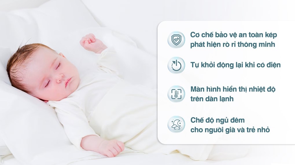 - Tự khởi động lại khi có điện với các thiết lập được chọn trước đó mà không cần phải điều chỉnh lại nhiệt độ làm lạnh mong muốn.