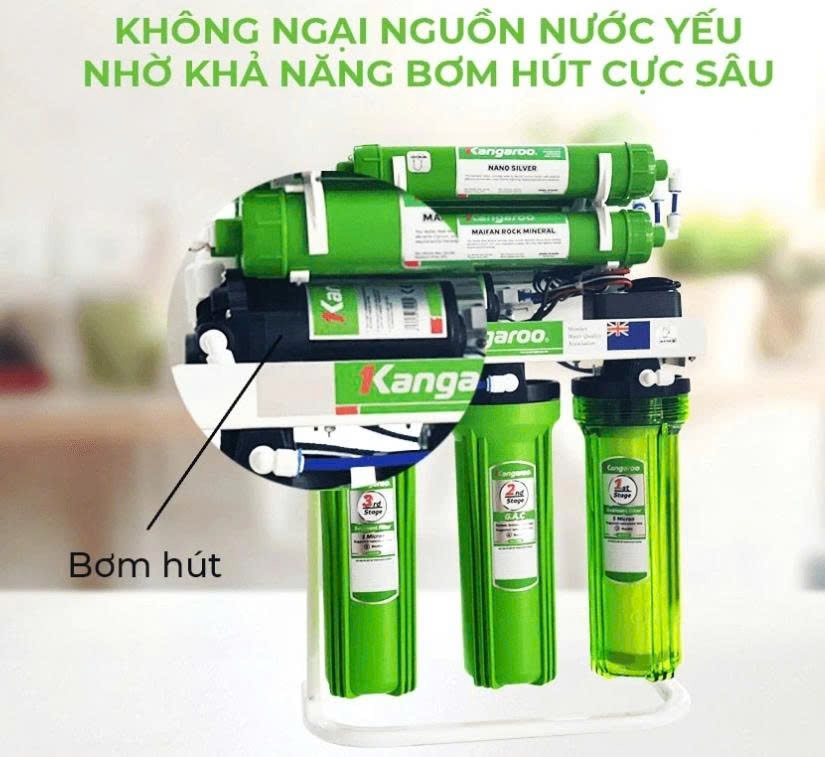 Máy lọc nước Kangaroo KGRP99 có khả năng hút sâu tới 3m sẽ sử dụng ở cả những nơi có nguồn nước cấp đầu vào yếu, phù hợp với cấu tạo đường nước khác nhau tại mỗi gia đình, nhờ vậy mà nguồn nước cấp luôn ổn định, giữ được độ tinh khiết, nâng cao tuổi thọ máy.