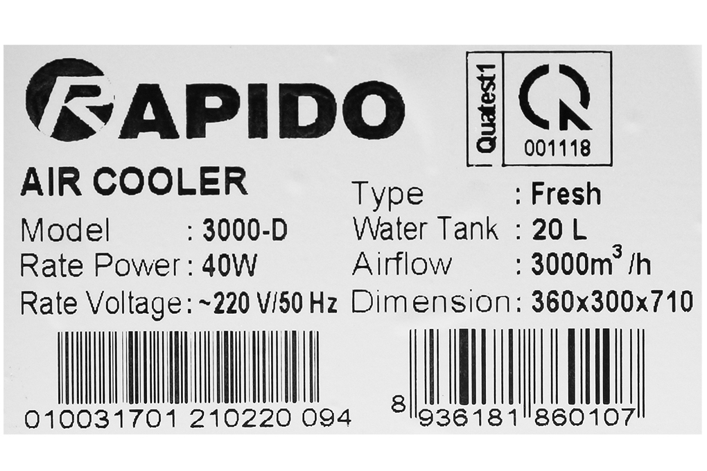 Quạt điều hòa không khí Rapido 3000D đẹp mắt, làm mát hiệu quả, tiết kiệm điện, gia dụng tốt phục vụ gia đình mùa nắng nóng.