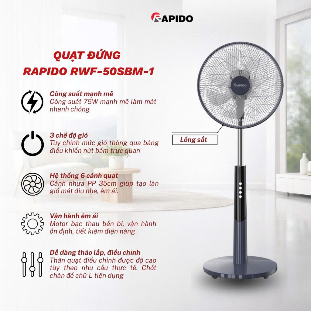 Rapido RWF-50SBM-1 gây ấn tượng với công suất mạnh mẽ lên tới 75W, tạo ra lưu lượng gió tối đa đạt 5000 m^3/h. Hệ thống 6 cánh quạt đường kính 35cm làm từ nhựa PP cao cấp được tối ưu hóa để đẩy luồng khí đi xa và mạnh hơn, giúp xua tan cơn nóng tức thì ngay cả trong những không gian mở. Sản phẩm sử dụng motor bạc thau chất lượng cao, đảm bảo quạt vận hành êm ái, ổn định và có tuổi thọ bền bỉ theo thời gian.